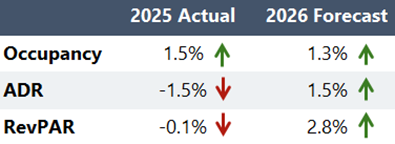 While RevPAR remained flat in 2025, we expect modest gains in both occupancy and ADR in 2026 given the strong convention calendar, in addition to anticipated improvement in leisure and corporate travel after the first quarter. This anticipated growth is expected to result in an annual RevPAR level that will (finally) surpass pre-pandemic levels. However, market occupancy below pre-pandemic levels has become the new norm for the Twin Cities.