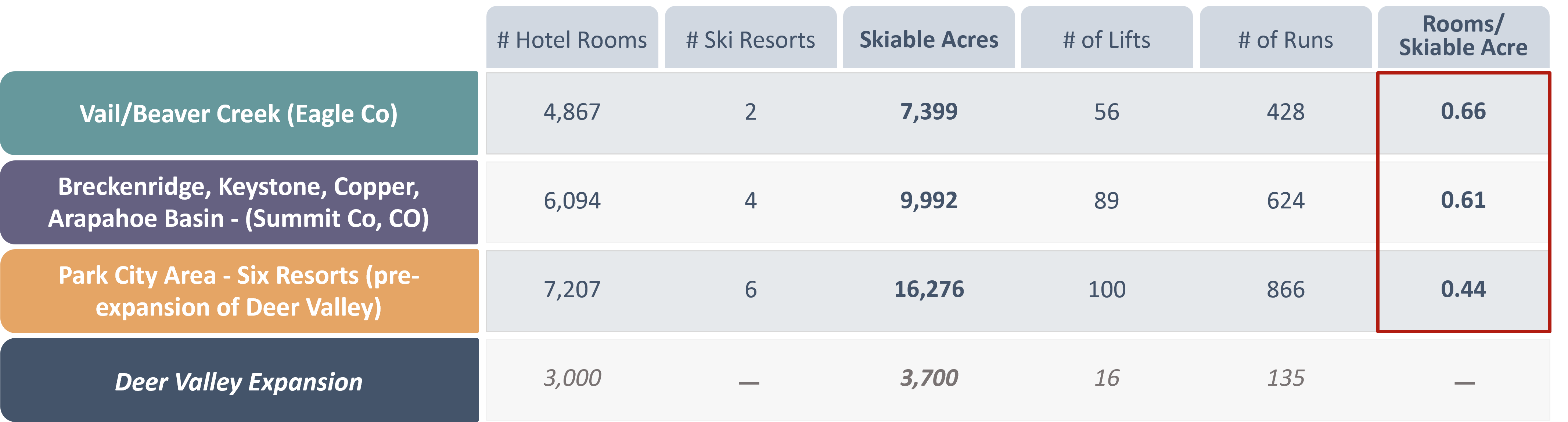 Given the size of Park City market, the combined metrics shown below were determined to be the most appropriate basis for comparison. Upon completion of the Deer Valley expansion, the greater Park City area will comprise nearly 20,000 skiable acres, exceeding the combined skiable terrain of Summit and Eagle counties in Colorado, which together encompass approximately 17,400 skiable acres.