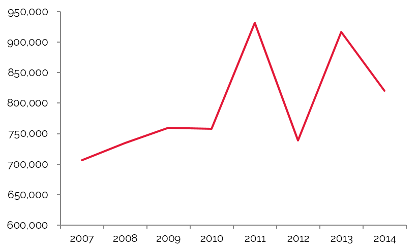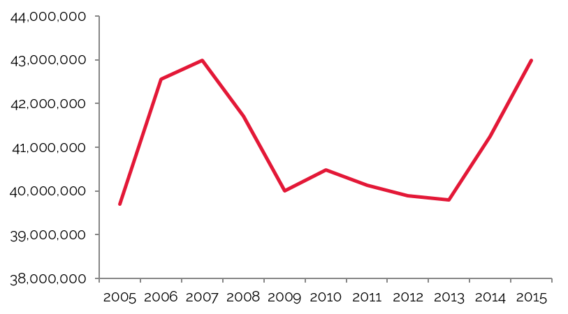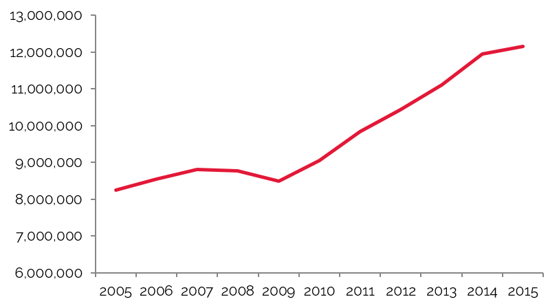 The largest primary sector was Total Services, which recorded the highest increase in number of employees during the period from 2010 to 2015, when this sector expanded by approximately 204,000 people, or 2.7%, and rising from 41.2% to 42.6% of total employment. Of the various sub-sectors included in Total Services, Health Care and Social Assistance was the largest.