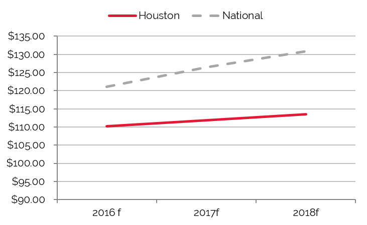 The following charts illustrate forecasted occupancy, average rate, and RevPAR trends for Houston from 2016 to 2018.