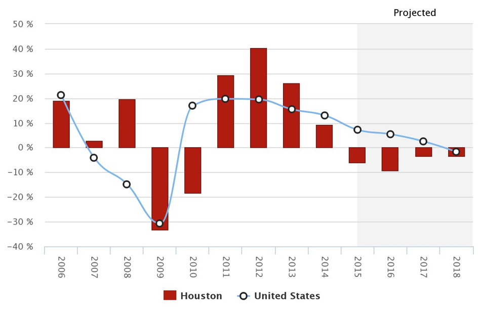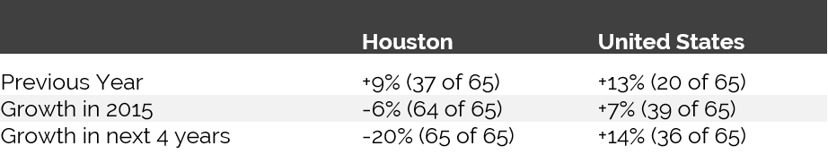 The HVI also provides insight into hotel values. In 2014, Houston ranked 37th among 65 major U.S. cities in hotel value growth; hotel values in Houston rose by more than 9% that year. Due to factors previously mentioned, Houston hotel values are anticipated to decrease by 6% in 2015, with a decrease of 20% between 2015 and 2018.