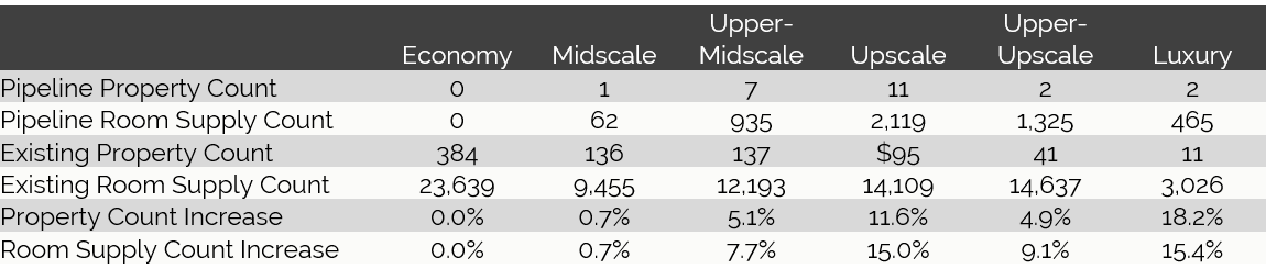 The table below reflects an increase of a minimum of 5,530 rooms, including seven proposed properties with an undetermined room count. The inclusion of proposed hotel projects that have not yet been made public would put the supply increase at approximately 6,500 rooms, or 8.5%.