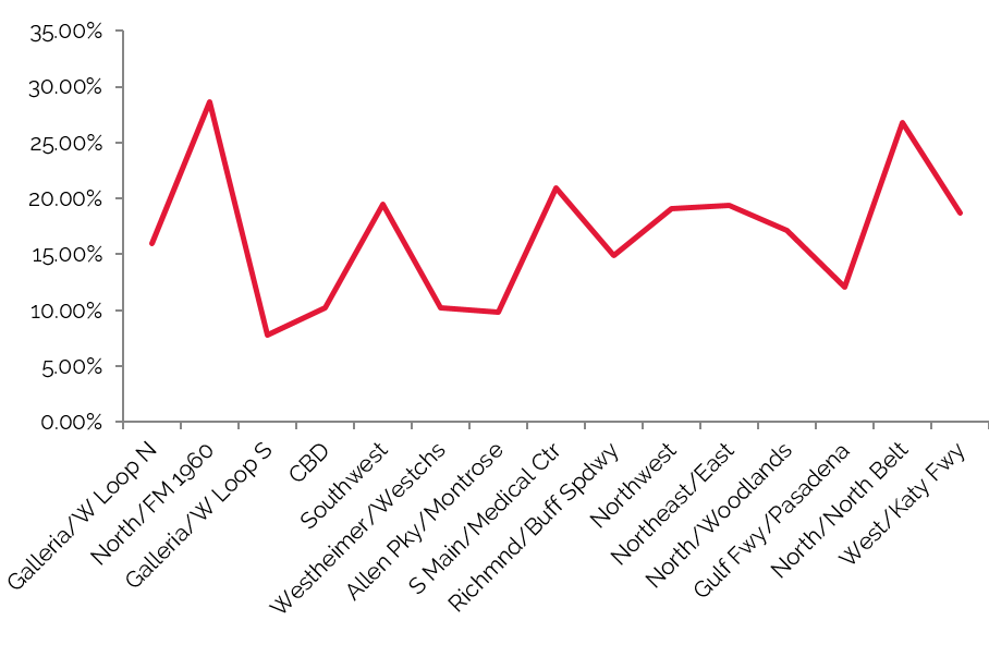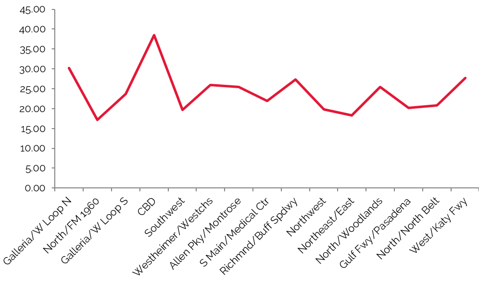 Trends in occupied office space are typically among the most reliable indicators of lodging demand, as firms that occupy office space often exhibit a strong propensity to attract commercial visitors. Thus, trends that cause changes in vacancy rates or in the amount of occupied office space may have a proportional impact on commercial lodging demand and a less direct effect on meeting demand. The following graphs detail office trends in the identified Houston submarkets, per REIS.