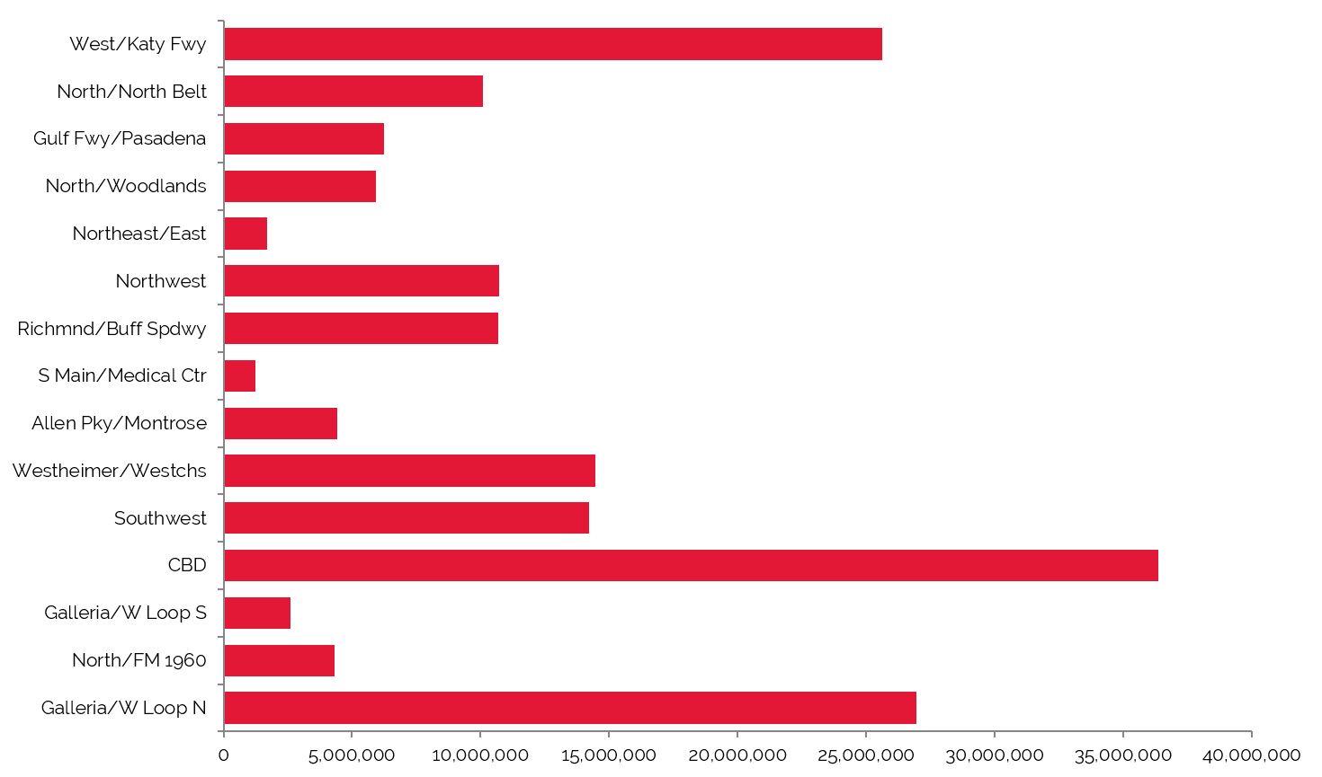 Greater Houston’s 172 million square feet of office space had an overall vacancy rate of 15.0% and an average asking rent of $27.49 for the third quarter of 2015. Houston’s abundance of Class A office space has made the city one of the most desirable in the south-central U.S.; revitalization efforts throughout the CBD and areas such as the Galleria have also helped make the city attractive to office tenants. With the most rentable square feet among all of Houston's submarkets, a low vacancy rate, and the highest rental rates, the CBD office market has proven to be a major hub for much of the city's growth and demand. High demand, in fact, has spurred the construction of 18 million square feet of office space throughout Houston, with 5.5 million square feet in Downtown Houston alone; this new office space supply is planned to enter the market between now and 2017.