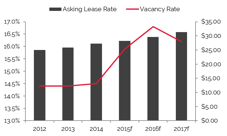 As the above chart illustrates, supply and demand aligned in 2014, resulting in market equilibrium. However, this effect is likely resulted from a increase in energy-related demand that year. It is anticipated that demand levels will recover by 2017. This trend is expected to result in a stabilized occupancy level of 66%, which is above the ten-year average for the Houston market.