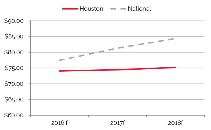 As witnessed across many markets across the nation, occupancy and average rate plummeted in Houston in 2009 and 2010, the result of a sharp decrease in demand coupled with an 6.0% increase in supply. The advent of new technologies for oil exploration along with the onset of a national economic recovery helped Houston’s hotel market recover fully by 2012. From 2011 through 2014, economic activity in Houston surged across all sectors, and the city’s hotel market experienced positive year-over-year increases in demand, occupancy, and average rate. An increase in demand coupled with the return of financing added more projects to the pipeline of new supply, and today approximately 5,000 rooms are under construction in the market and scheduled to open between 2016 and 2017.