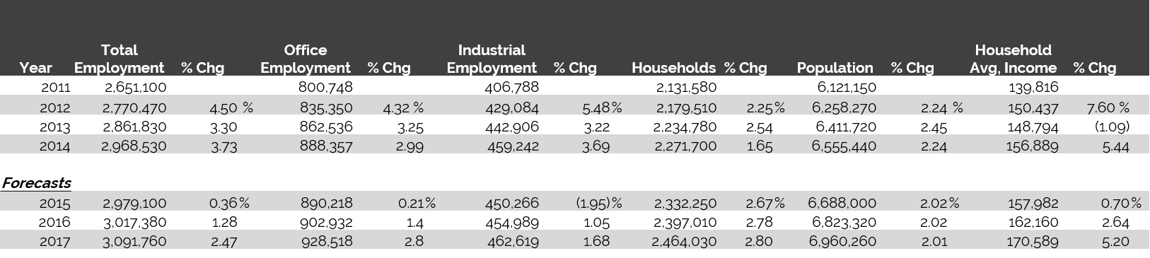 The following table illustrates historical and projected employment, population, and income data for the overall Houston market as presented by REIS.