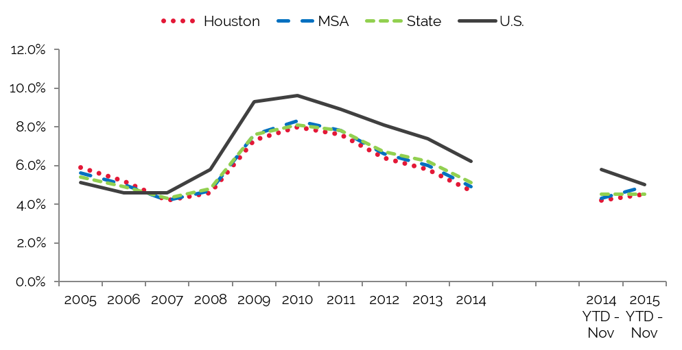 We note that local unemployment remains below the national average. According to the Greater Houston Partnership, job growth has been prevalent in the construction, healthcare, and leisure and hospitality sectors. Furthermore, the strength of the hydrocarbon and technology industries and an improvement in the real estate market should support Houston’s economic fundamentals and allow for some job growth in 2015, despite layoffs at some of the Houston-based energy companies.