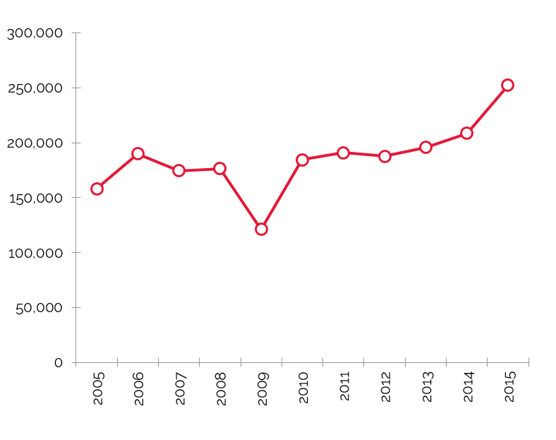 Passenger traffic at George Bush Intercontinental Airport has fluctuated in the past decade, with a decrease starting in 2010 in part due to the Continental Airlines and United Airlines merger, which created routes that are more efficient. Passenger traffic began to increase in 2013, and August 2015 recorded roughly 485,953 more passengers than August 2014, a 4.1% increase. Houston Hobby Airport has realized a steady increase in passenger traffic since 2010, though 2015 data show a slowdown attributed to airport renovations. The addition of international flights at the recently opened terminal should help passenger levels regain strength. These figures, which represent a growing trend in visitation to Houston, speak indirectly to the strength of Houston’s commercial, convention, healthcare, and leisure sectors.