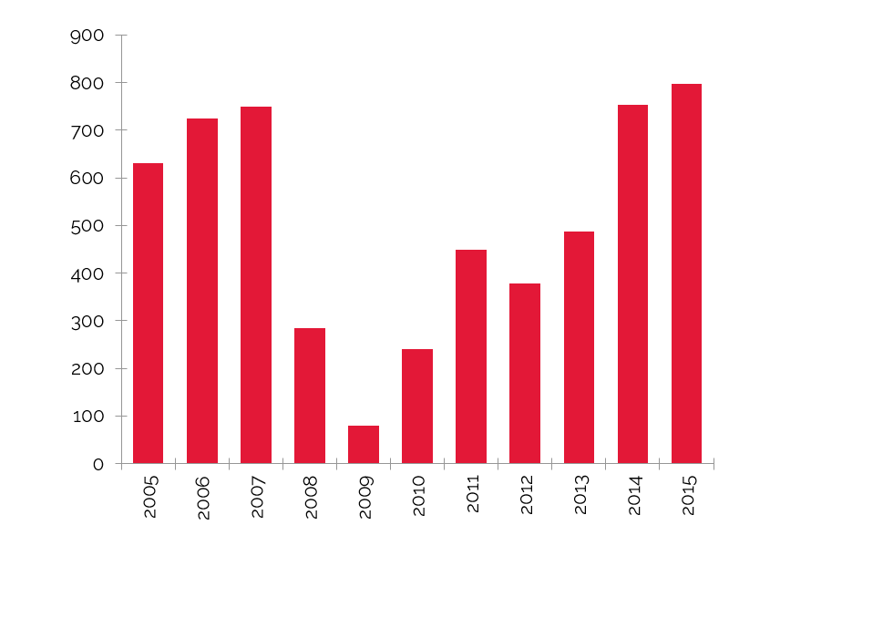 In comparison, transaction activity nationwide remains strong, with an ever-increasing number of transactions and higher prices per room. The following charts illustrate transaction activity nationwide over the last ten years.