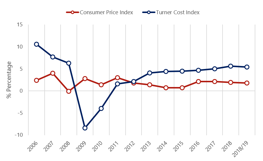 As it relates to hotel development, issues related to low unemployment, creating an increase in labor costs and a decrease in the availability of labor in general, as well as the implementation of tariffs, have remained at the forefront of discussions for developers given rising construction costs associated with both labor and materials. According to the Turner Building Cost Index, which has tracked costs in the non-residential building construction market in the United States since 1967, the index increased by 5.6% in 2018 and by 5.4% in the 2018/19 trailing twelve months ending in June 2019. According to Turner, the index has increased year-over-year since 2011, significantly outpacing inflation since 2012. Rider Levett Bucknall (RLB), which also provides a quarterly construction cost report, illustrated a rise in its construction cost index of approximately 5.2% in 2018, with metropolitan areas such as San Francisco, Chicago, Seattle, Portland, and Phoenix reporting increases between 6% and 7% per year. The Turner Building Cost Index is determined by the following factors on a nationwide basis: labor rates and productivity, material prices, and the competitive condition of the marketplace. The change in the Turner Construction Cost Index compared with the change in the Consumer Price Index (CPI) during the same period is illustrated in the following graphic.