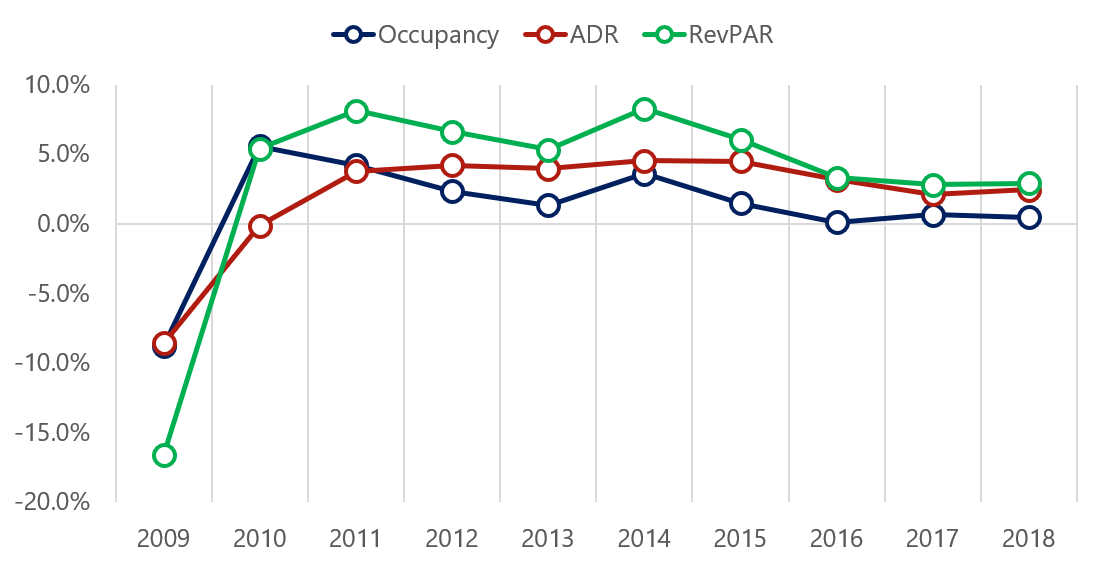 Given the pace of new supply growth, it is important for market participants, including hotel developers, lenders, and consultants, to exercise caution and discipline when considering new projects. Following a decade of consecutive growth since 2009, it can be agreed that we have reached the top of the cycle in terms of hotel occupancy. The nation’s lodging sector has never operated consistently with occupancies higher than those realized in 2018; moreover, the year-to-date performance supports this claim, with hotel occupancies remaining perfectly flat when compared with the corresponding data during the same period last year. As such, since 2016, RevPAR growth has been mostly generated by an increase in ADR, which has been limited by increases in inflation and kept at bay by steady increases in supply. Thus, the national hotel market has been operating at a point of general equilibrium since 2016, with both supply and demand in balance, and revenues growing at a pace similar to inflation.