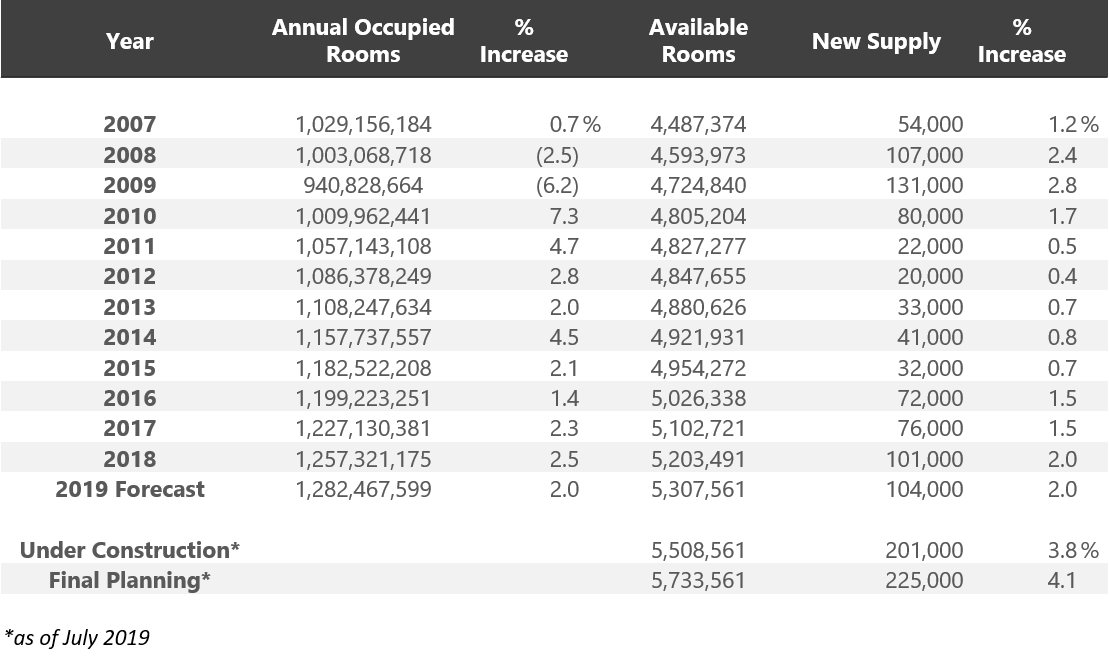 According to the American Hotel & Lodging Association (AHLA), as of July of 2019, 201,000 new hotel rooms were under construction across the country, representing an imminent supply increase of 3.8% over an 18-month period. Additionally, at the same time, 225,000 rooms were in the final planning stages and expected to begin construction within the next twelve months. As such, the data indicate that the pace of hotel development and new supply may continue a momentum of approximately 2.0% to 2.5% annual growth in the next two to three years, at a pace similar to the last peak of the development cycle in 2008/09. However, it is important to note that actual supply growth may be less than suggested by the data above, as slowing RevPAR growth, coupled with the rapid increase in construction costs, will cause developers to delay some projects indefinitely (or cancel them altogether), as competition for construction labor and materials among various product types, such as commercial, residential, and public works, continues to increase.