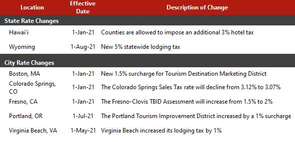 In addition to the state and local rate changes that took place during fiscal year 2020, HVS projects the following changes for fiscal year 2021 and beyond.
