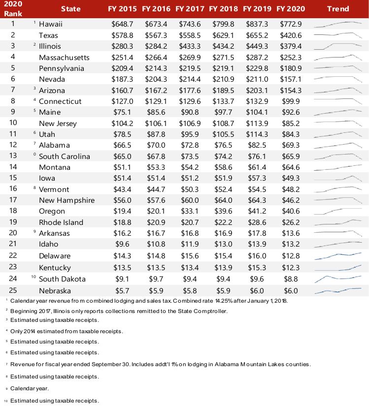 The following table presents a six-year history of lodging tax revenue for each of the twenty-five states that have imposed a dedicated lodging tax. Revenue reported from past years has been adjusted for inflation. Data is presented in millions of dollars, and the states are ranked by 2020 revenues.