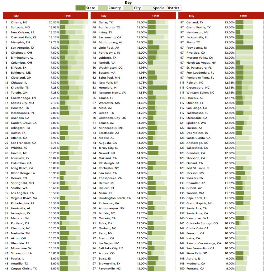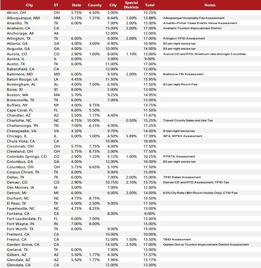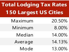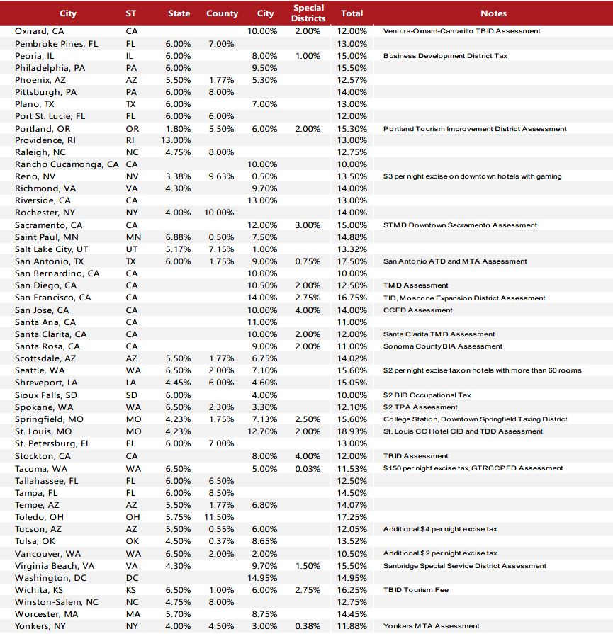 HVS researched the total tax rate applied to lodging accommodations in the 150 most populous United States cities as projected from the 2010 census. The total tax rate is comprised of all state, county, city, and special district taxes levied on lodging facilities within the urban center of the city where the highest special district taxes may be applied. The following tables list the tax rate applied to overnight stays at lodging facilities at the state, county, city, and special district levels, as well as the total rate imposed on an overnight stay at a lodging facility in the urban center of each of the 150 largest cities in the United States..jpg)