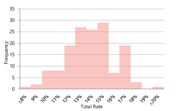 The figure below shows a distribution of combined lodging tax rates in the 150 largest U.S. cities.