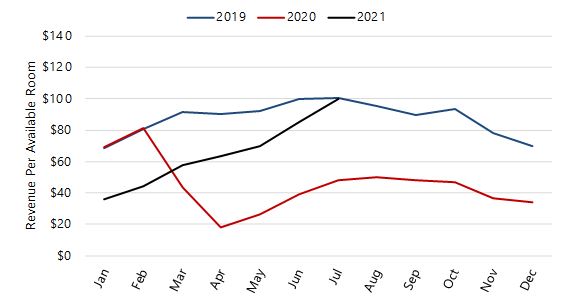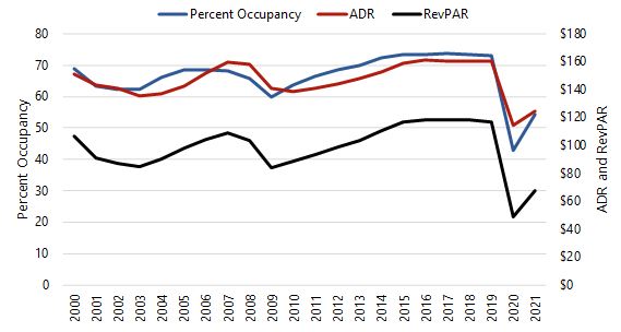 The figure below shows the ADR, occupancy rate, and RevPAR for the major US markets from 2000 to 2020 and the July year-to-date figures for 2021.