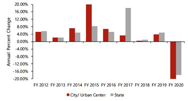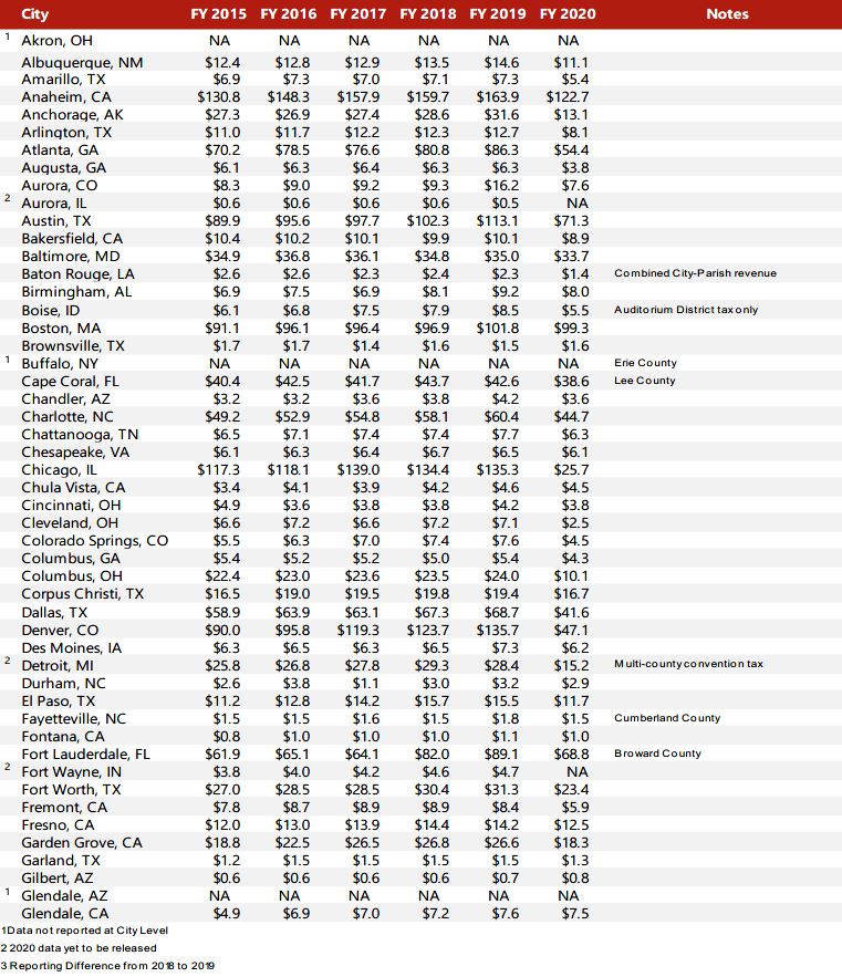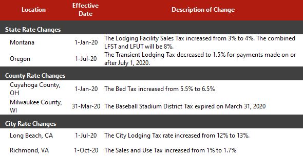 State, county, and local governments passed into law a number of rate changes that took effect during or immediately following fiscal year 2020. Recent changes in lodging taxes in cities include the following:.jpg)