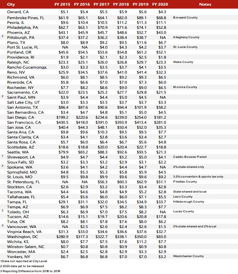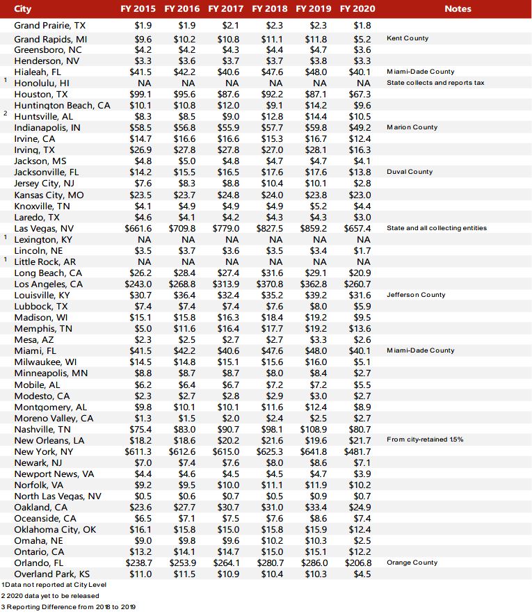 The following tables describe the lodging tax revenue that the 150 most populous cities collected from lodging taxes. Unless otherwise noted, the tax rate and revenue listed only pertains to the citywide lodging tax and does not include special district taxes or city sales taxes. Consequently, the revenue figures presented for comparable cities can diverge greatly. For example, a city in California with an average lodging tax rate will show greater revenue year over year than a similar city in Nevada, where taxes are levied primarily at the state and special district level. For individual cities, revenues are reported from consistent sources each year.In some states and cities, lodging taxes are imposed by the county rather than city level. For example, cities in Florida, Indiana, and parts of New York do not levy municipal lodging taxes. In such cases, we list county lodging tax revenues. Year-over-year revenue changes may reflect tax rate changes and underlying changes in taxable receipts for lodging.