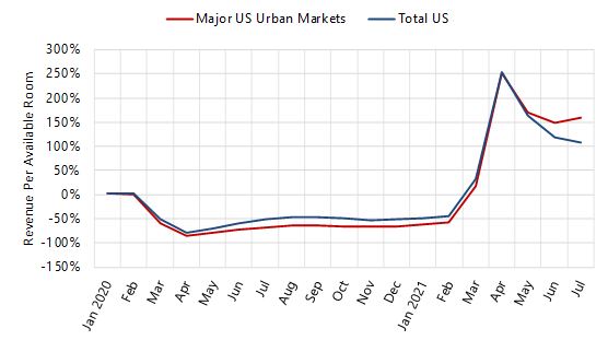 During the COVID-19 pandemic, RevPAR declined more severely in major US markets than in the United States as a whole. Beginning in April 2021 and onward, major US markets have outpaced recovery compared to the US as a whole, largely due to the distribution of the vaccine and return of major tourist destinations such as Orlando, Oahu, and New York City.