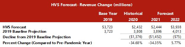 In 2021, lodging tax revenues in the 25 major markets are estimated to fall short of the baseline by approximately $1.45 billion, which is greater than losses in 2020. Due to lag effects, 2020 captured more non-COVID-19 impacted months than 2021. The rapid pace of recovery through the end of 2021, assuming recovery is not derailed by unforeseen circumstances, suggests that 2022 losses will diminish to under $100 million compared to the baseline. Losses of this magnitude will continue to stress state and local government budgets and local tourism efforts. The recovery of the hospitality industry relies on its personnel and continued losses in lodging tax revenues may prolong an already-tenuous recovery.