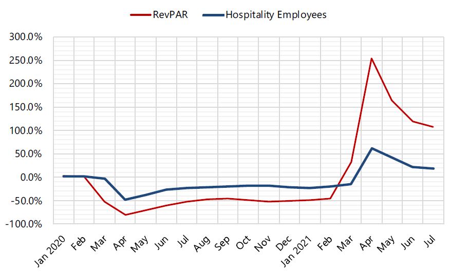 Employment is a separate metric to measure the rate of recovery in the hospitality industry. The figure below compares the rate of recovery for RevPAR across the United States verus the percentage change in employment throughout the hospitality industry.