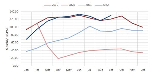 While the negative impacts of the COVID-19 pandemic were unprecedented as documented in the 2021 HVS Lodging Tax Study, the recovery of the industry is occurring at a faster pace than most analysts originally anticipated. Revenue per available room (“RevPAR”), the product of average daily room rate and occupancy rate is a standard industry metric that combines the effects of occupancy and average daily room rate changes on hotel revenue performance. The figure below compares the amounts of RevPAR in the top 25 US urban markets for each month from January 2019 through September 2022..jpg)