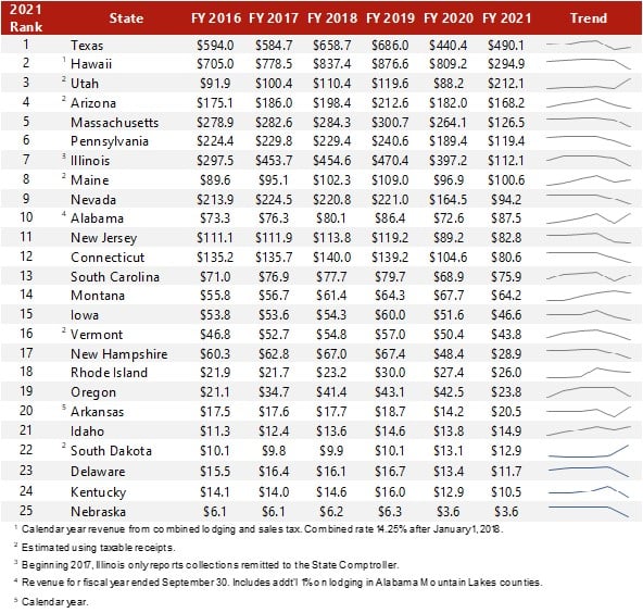 The following table presents a six-year history of lodging tax revenue for each of the twenty-five states that have imposed a dedicated lodging tax. Revenue reported from past years has been adjusted for inflation. Data is presented in millions of dollars, and the states are ranked by 2021 revenues.