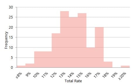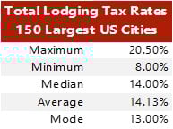 The figure below shows a distribution of combined lodging tax rates in the 150 largest U.S. cities.
