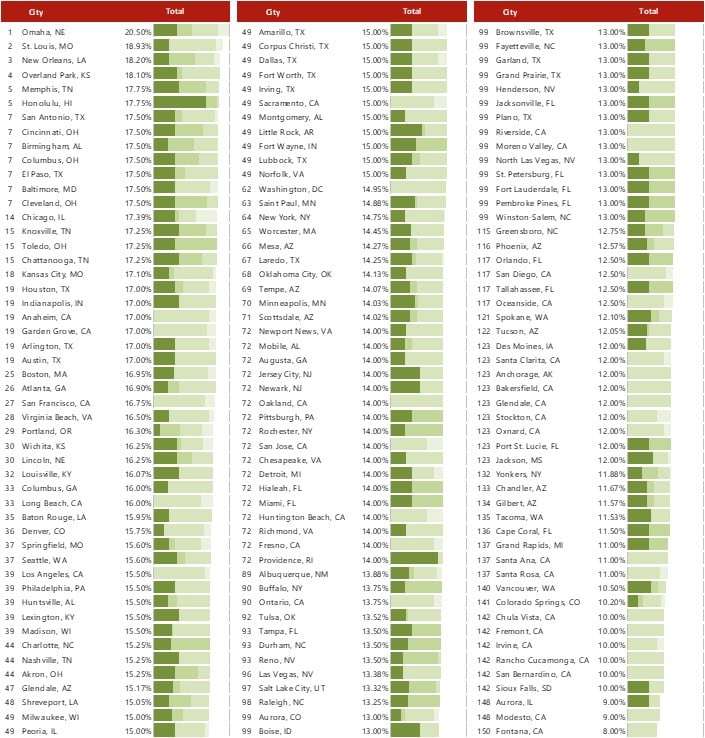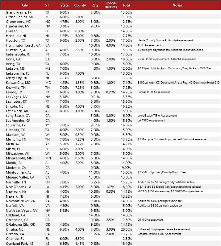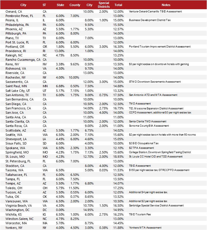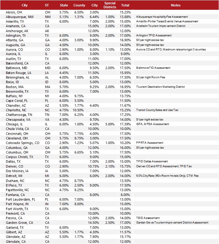 HVS researched the total tax rate applied to lodging accommodations in the 150 most populous United States cities as projected from the 2010 census. The total tax rate is comprised of all state, county, city, and special district taxes levied on lodging facilities within the urban center of the city where the highest special district taxes may be applied. The following tables list the tax rate applied to overnight stays at lodging facilities at the state, county, city, and special district levels, as well as the total rate imposed on an overnight stay at a lodging facility in the urban center of each of the 150 largest cities in the United States.