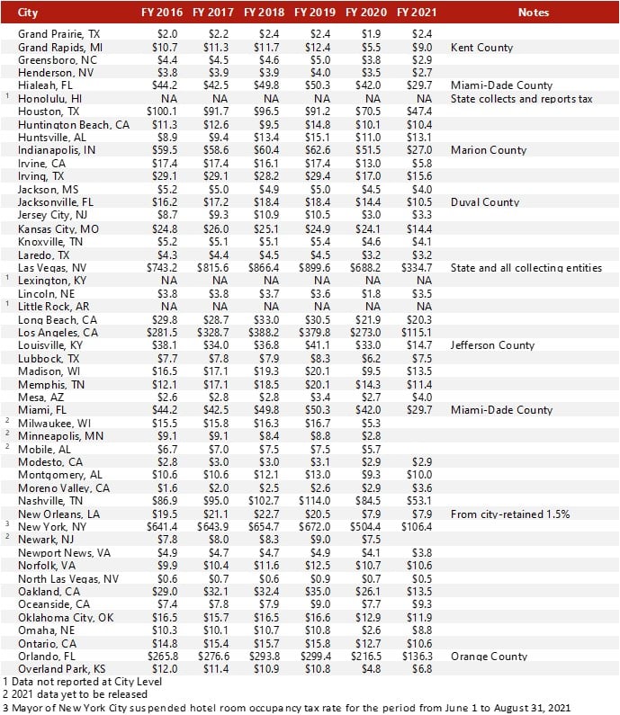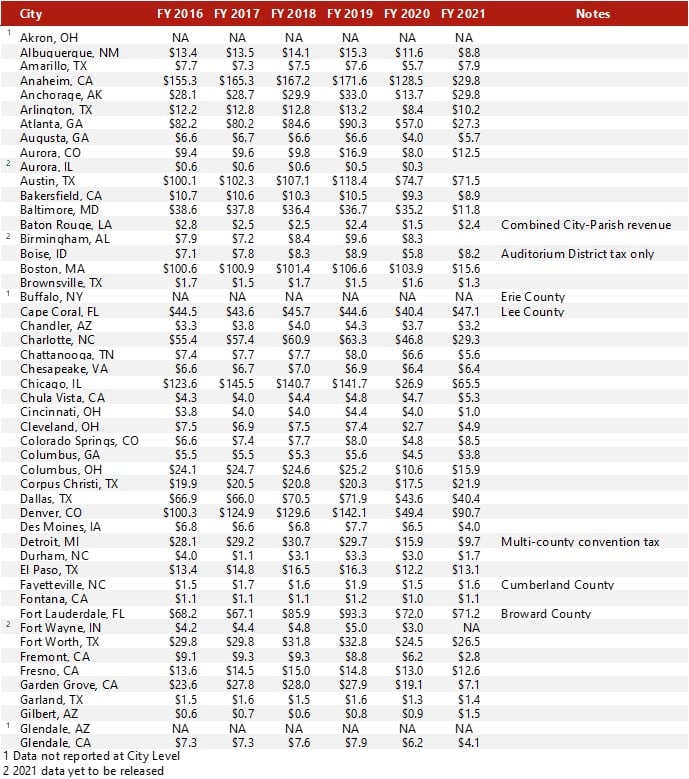 The following tables describe the lodging tax revenue that the 150 most populous cities collected from lodging taxes. Unless otherwise noted, the tax rate and revenue listed only pertains to the citywide lodging tax and does not include special district taxes or city sales taxes. Consequently, the revenue figures presented for comparable cities can diverge greatly. For example, a city in California with an average lodging tax rate will show greater revenue year over year than a similar city in Nevada, where taxes are levied primarily at the state and special district level. For individual cities, revenues are reported from consistent sources each year.In some states and cities, lodging taxes are imposed by the county rather than city level. For example, cities in Florida, Indiana, and parts of New York do not levy municipal lodging taxes. In such cases, we list county lodging tax revenues. Year-over-year revenue changes may reflect tax rate changes and underlying changes in taxable receipts for lodging.