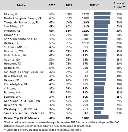 By the spring of 2022, monthly RevPAR has met or exceeded 2019 levels in the top 25 US lodging markets.
