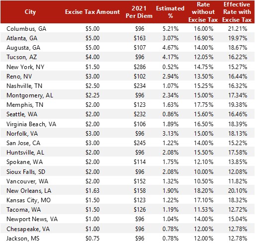 In addition to percentage taxes on gross room revenues, some hotels are also subject to excise taxes on lodging transactions. States, cities, or special districts may charge a flat fee per room night on all hotel rooms within their boundaries. Excise taxes tend to be less volatile because their amount only depends on the occupancy and is not subject to room price variations. However, excise taxes do not grow with inflation or room rate increases.Hotels in 24 cities are subject to a state, city-wide or special district excise tax. Excise taxes range from $0.75 to $5.00 per room night, with an average of $2.50. HVS calculated each city’s excise tax as a percent of its per diem rate (in fiscal year 2021 dollars) to estimate effective tax rates. A city’s “effective rate” indicates the average rate a person pays if the excise tax were included as a percent of total sale price. For this example, HVS used the per diem rates set by the U.S. General Services Administration (GSA). The per diem rates set by the GSA are usually lower than the average daily rates at hotels in the specified areas. The chart below is for illustrative purposes only.