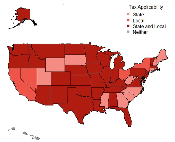 The map below shows the states in which Airbnb applies only local lodging taxes or a combination of state and local lodging taxes.