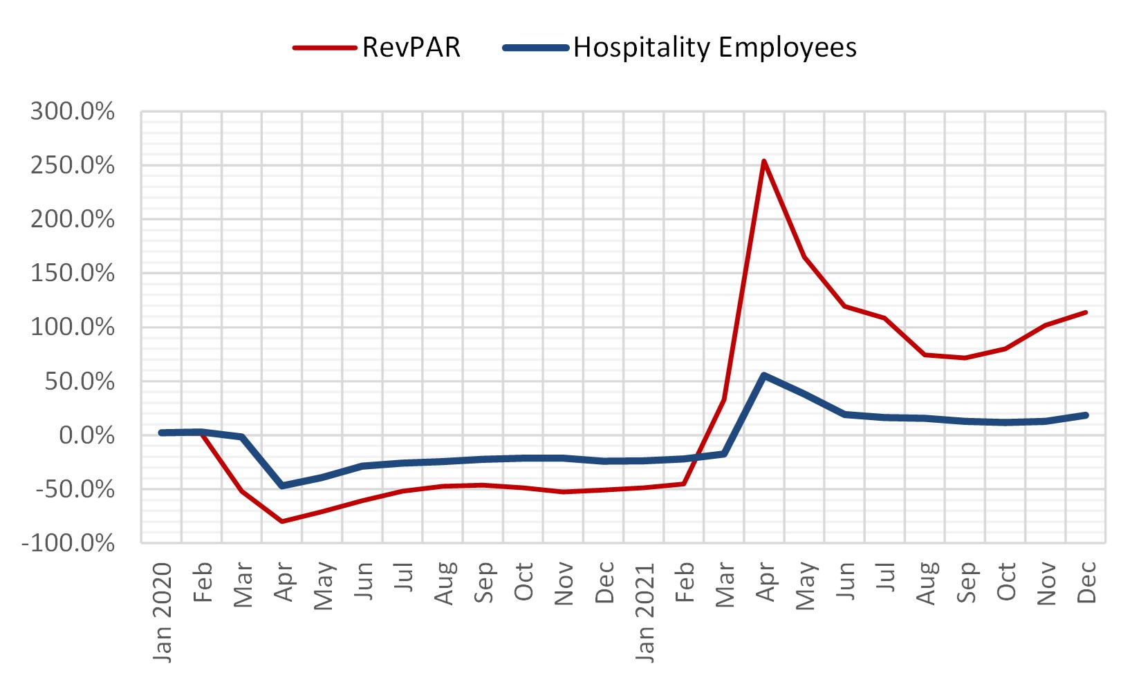 Reconstituting the labor force in the industry has been a significant impediment to growth. The lack of staff has at times prevented many hoteliers from making their full inventory of rooms available for rental, causing the absorption of demand during peak periods to be less than optimal. The figure below compares the percentage change in hospitality employment with the percentage change in RevPAR.