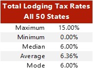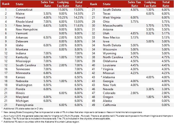 All but two states impose a sales tax, a lodging tax, or both on overnight transient accommodations. Municipal governments impose lodging taxes in two states (Alaska and California) that do not tax hotel lodging. Twenty-five states impose lodging taxes that are not part of a broader sales or use tax. The table provided on the following page lists the sales tax, lodging tax, and total tax rate levied on lodging accommodations. It ranks the 50 states by the total tax rate applied to lodging.