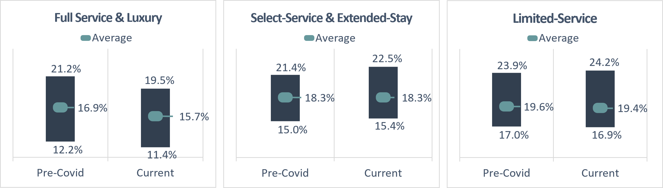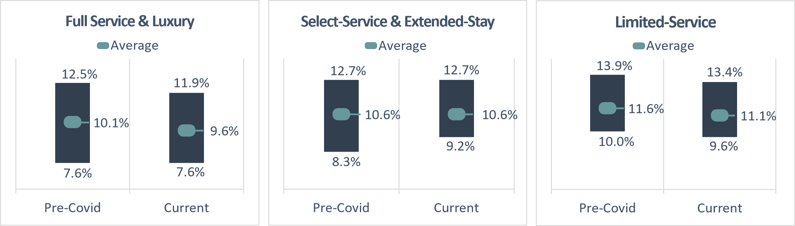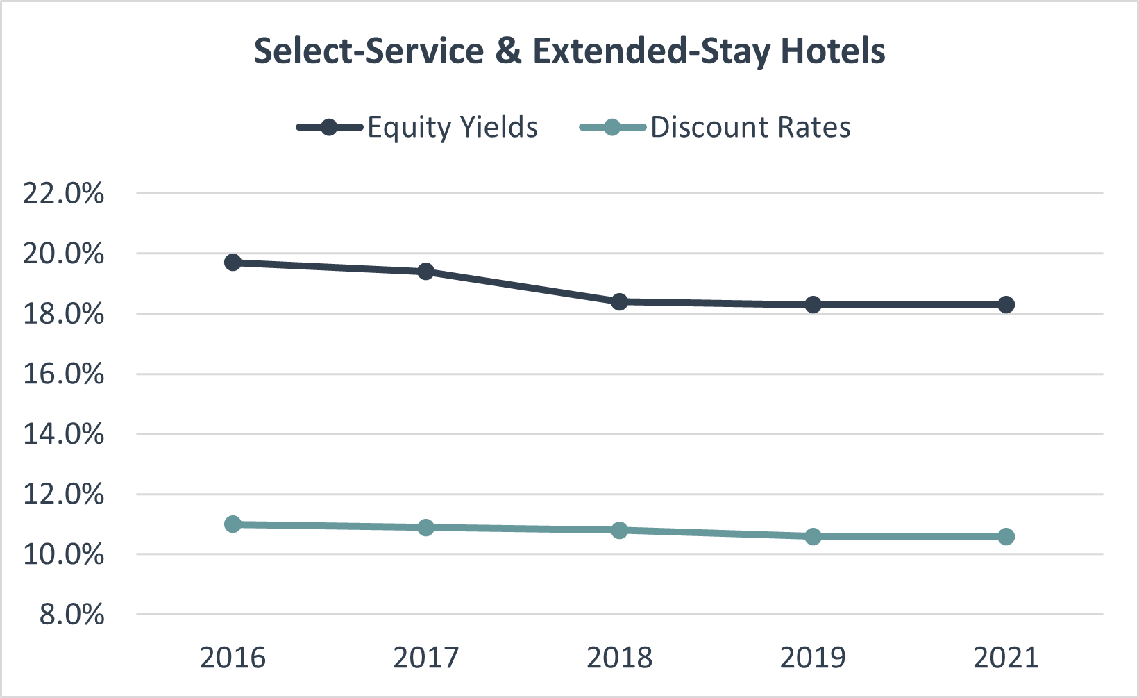 Equity yield rates for the select-service and upscale limited-service/extended-stay hotels currently average 18.3%, which is in line with the pre-COVID level. The average equity yield rate for lower-tier limited-service hotels similarly showed a very modest decline from 19.6% to 19.4%.