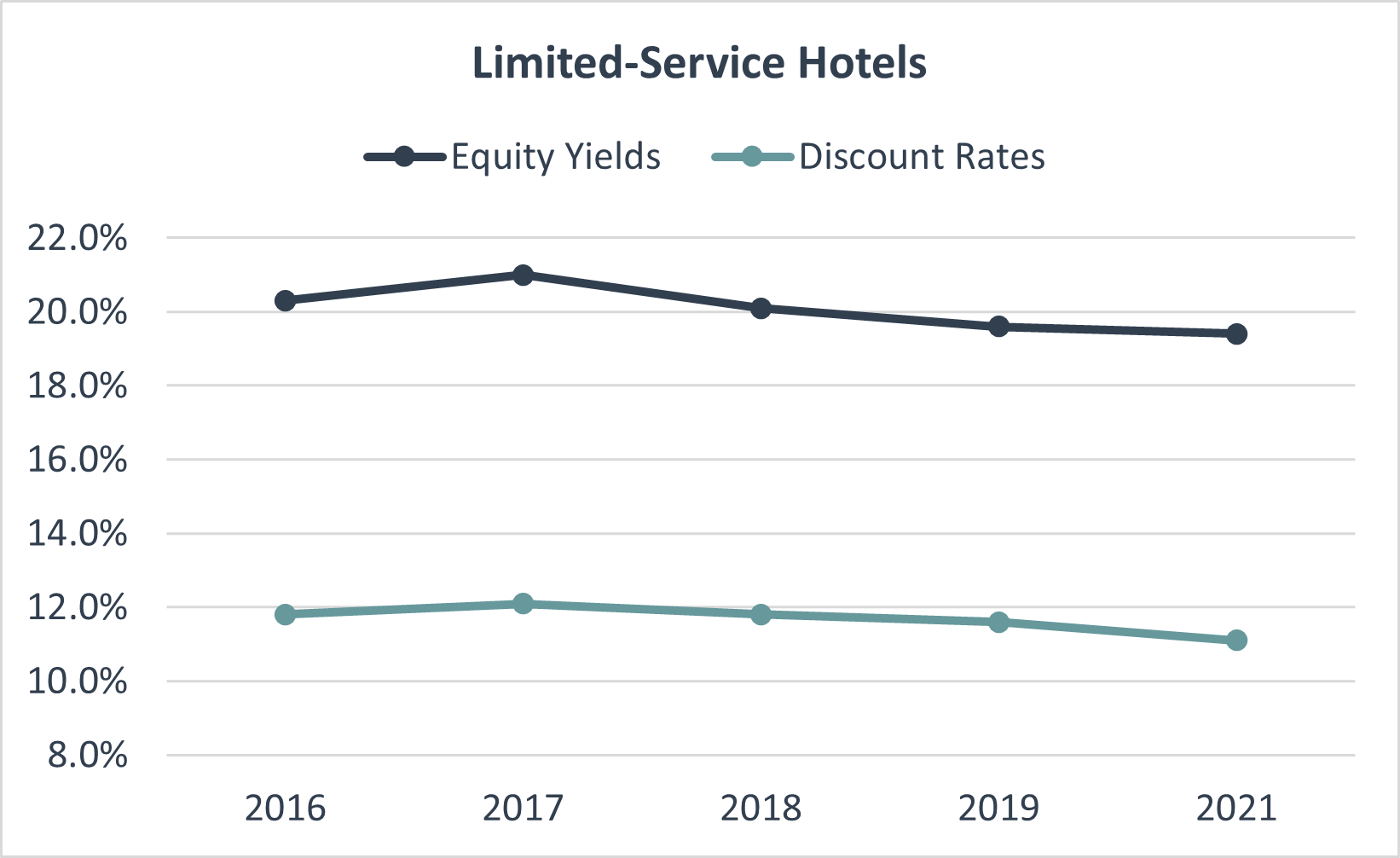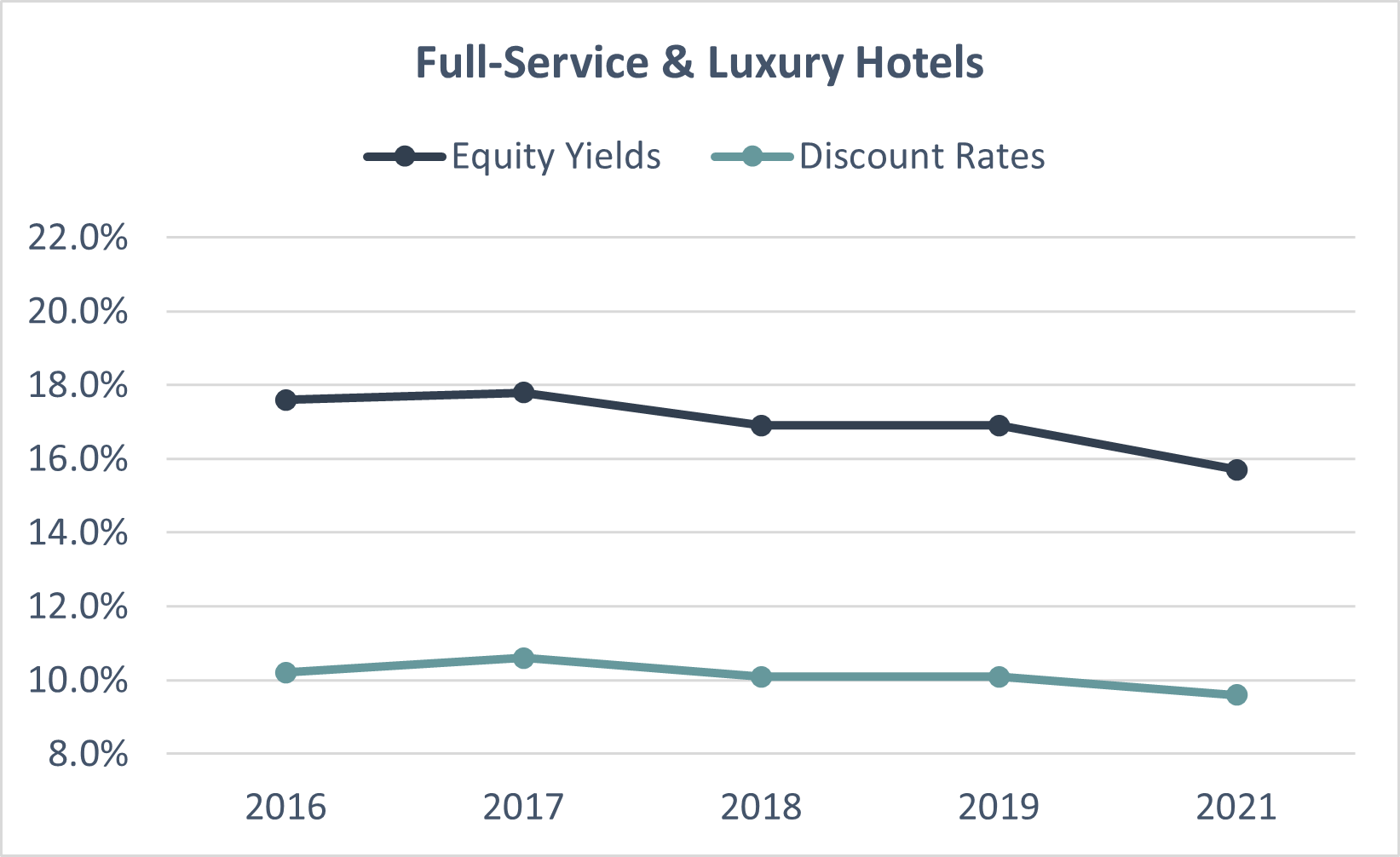 The charts below illustrate historical trends for both equity yields and discount rates by hotel service level. It is important to note that sufficient data were not available for 2020.