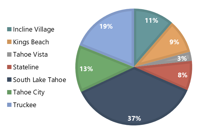 The following charts illustrate the mix of supply (listing nights) between the primary rental cities around the lake, as well as the change in listing nights for each city over the past five years.2022 Lake Tahoe STR Supply (Listing Nights) by City